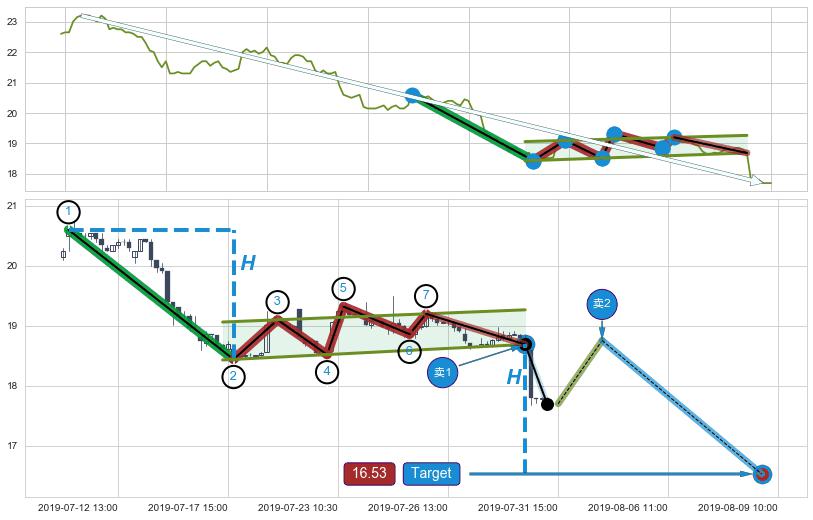从2019-06-19 13:00至2019-07-23 10:30,共包含137个小时,阶段股价下跌-15.66%,阶段股价变动位移路程比: 1 : 4,下跌趋势角度: 47.2
