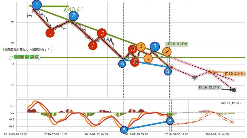 ➣ 预测:2019-08-12 15:00,【试探阻力】稳定目前下跌趋势的前提下,预测价格:17.29