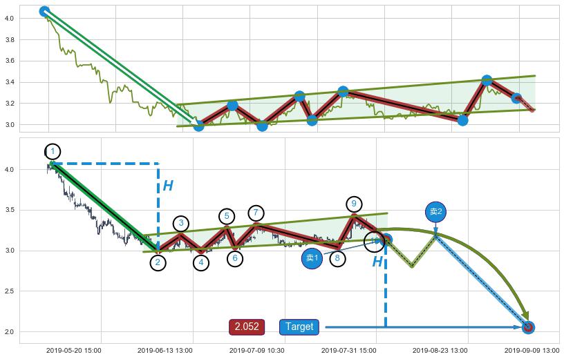 ➣ 最小中继整理跌幅→𝐇: 0.34000 (上平行阻力线与下平行支撑线的垂直距离)