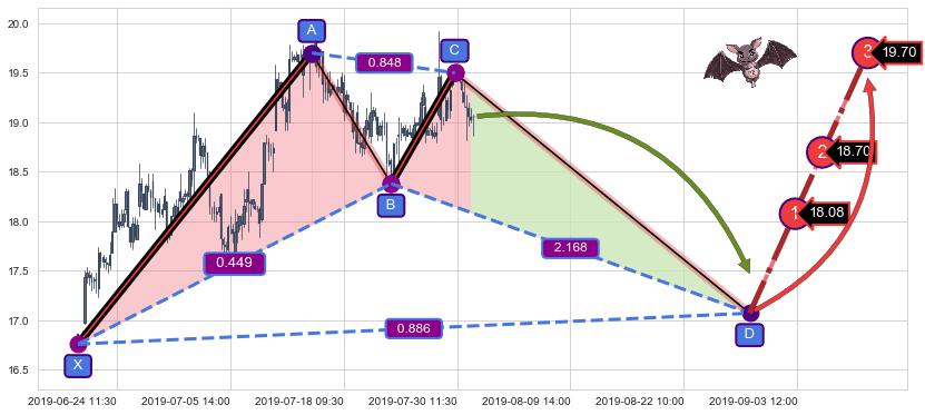 ➢ 距离预测D点位置有足够的下跌空间, 与看涨【蝙蝠】形态相反,实际方向【看跌】
