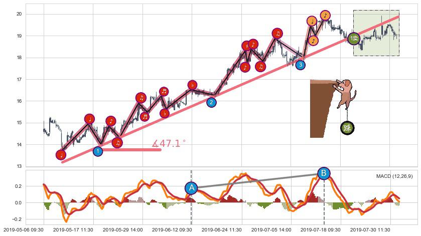 从2019-05-09 10:30至2019-07-15 13:00,共包含267个小时,阶段股价上涨37.23%,阶段股价变动位移路程比: 1 : 4,上涨趋势角度: 47.1