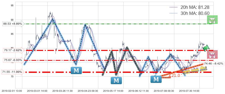 ♘ 阻力价格位88.53,可信任强度54.66%,距离最后交易2019-08-02 15:00形成的收盘价格81.30相差 +8.89%