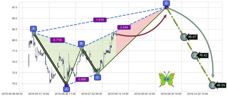 ➢ 距离预测D点位置有足够的上涨空间, 与看跌【蝴蝶】形态相反,实际方向【看涨】