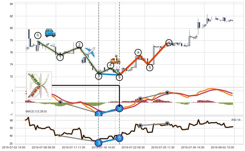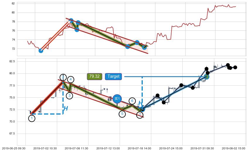 从2019-07-19 13:00至2019-08-02 15:00,共包含63个小时,阶段股价上涨7.65%,阶段股价变动位移路程比: 1 : 3
