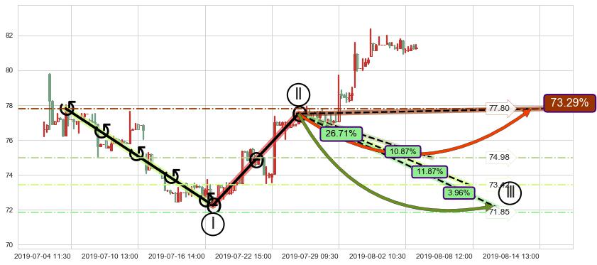 2019-07-26: 第一支撑位76.91有效抑制了下跌浪,成功阻止了价格的继续下跌。