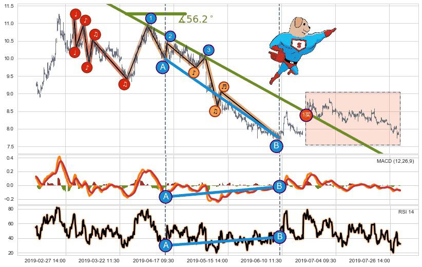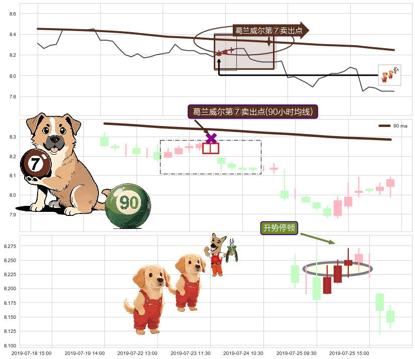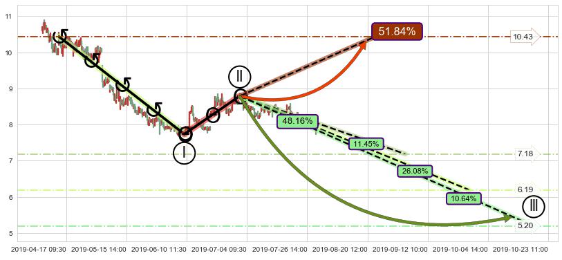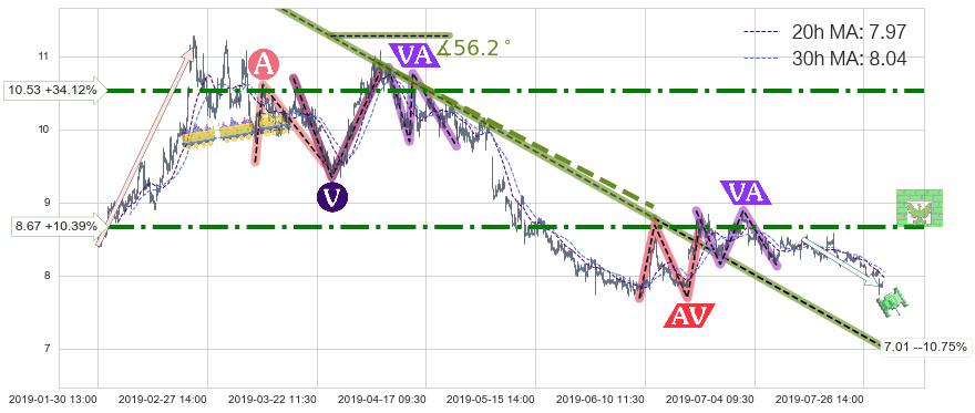 从2019-07-09 10:30至2019-07-31 15:00,共包含101个小时,阶段股价下跌-4.17%,阶段股价变动位移路程比: 1 : 9