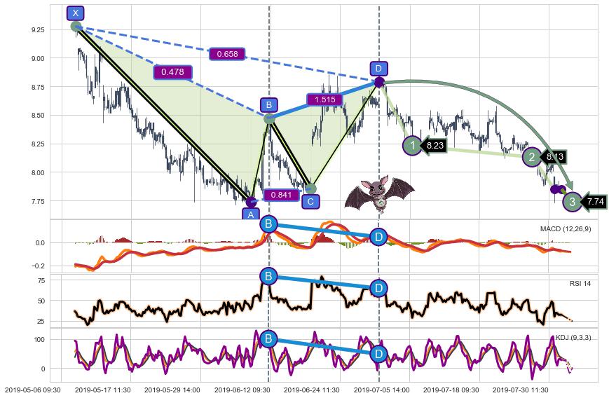 ➣ 已完成【蝙蝠】形态起点X: 05-07:14, 终点D: 07-02:09, 共219交易小时