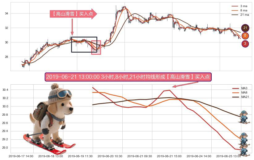 ⚀ 2019-06-19 11:30:00小时-2019-06-25 13:00:00小时显现 3小时-8小时-21小时均线 【高山滑雪】买入点 看多信号,后市看涨,买入
