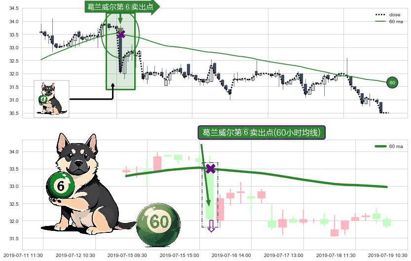⚀ 2019-07-16 09:30:00-小时显现 葛兰威尔均线 60小时均线 第⑥卖出点 走势反转见顶信号,后市看跌,卖出信号