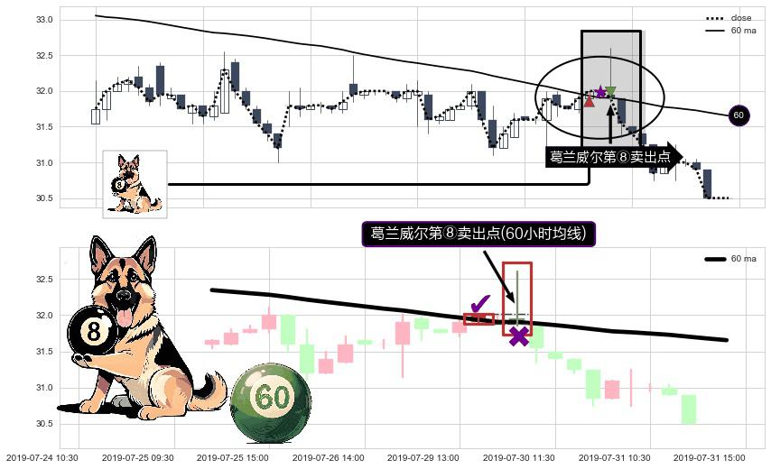 ⚀ 2019-07-30 09:30:00-小时显现 葛兰威尔均线 60小时均线 第⑧卖出点 下降趋势的中继信号,后市看跌,卖出信号
