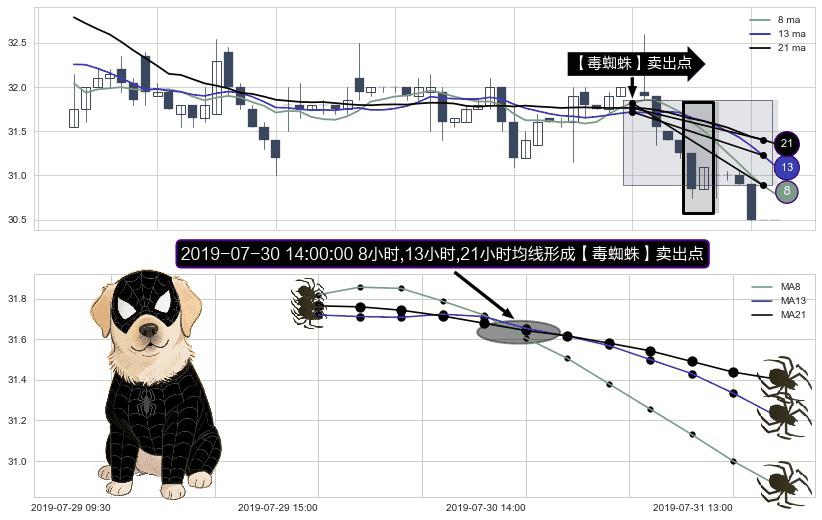 ⚀ 2019-07-30 14:00:00小时显现 8小时-13小时-21小时均线 【毒蜘蛛】卖出点 看空信号,后市看跌,卖出