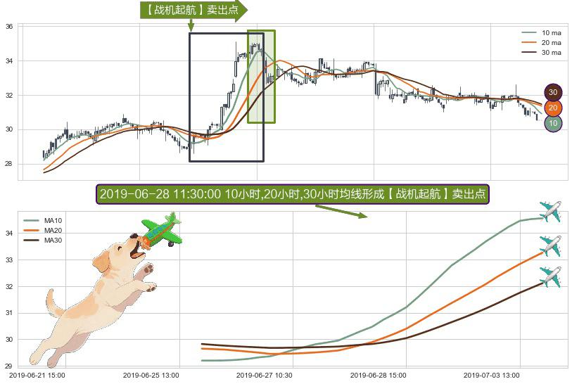 ⚀ 2019-06-25 15:00:00小时-2019-07-03 15:00:00小时显现 10小时-20小时-30小时均线 【战机起航】卖出点 看空信号,后市看跌,卖出