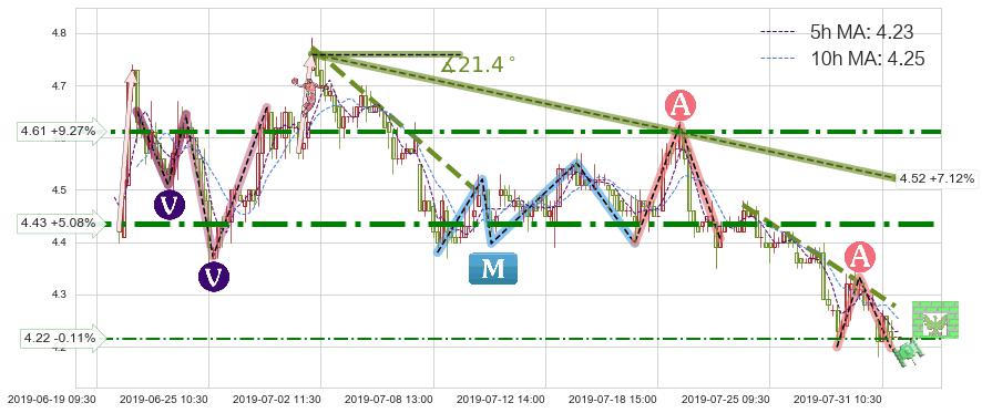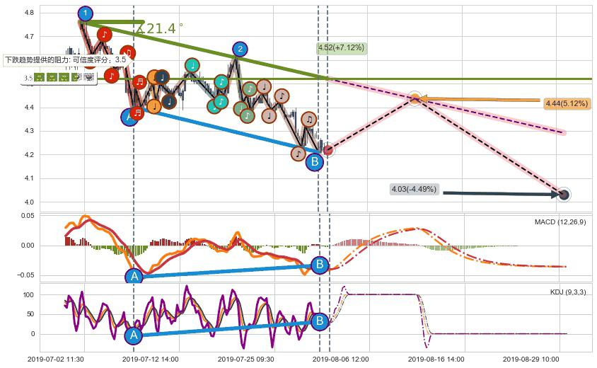 ➢ 预测:2019-08-12 13:00,【小幅反弹】稳定目前下跌趋势的前提下,预测价格:4.44
