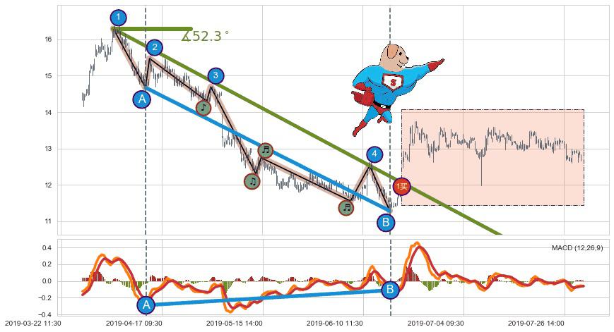 从2019-04-04 09:30至2019-06-20 15:00,共包含300个小时,阶段股价下跌-18.23%,阶段股价变动位移路程比: 1 : 11,下跌趋势角度: 52.3