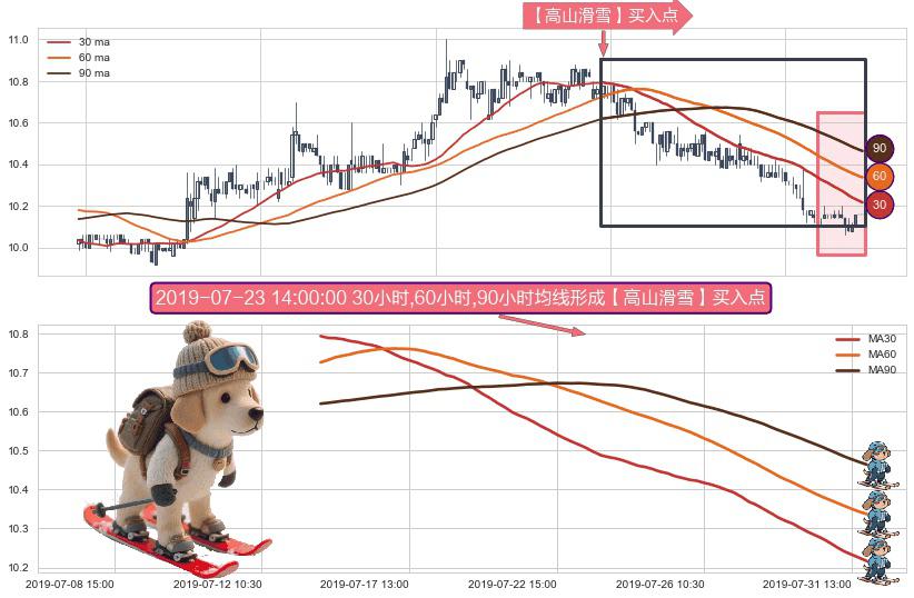 形态多维评估: ⚀ 2019-07-15 13:00:00小时-2019-07-31 15:00:00小时显现 30小时-60小时-90小时均线 【高山滑雪】买入点 看多信号,后市看涨,买入