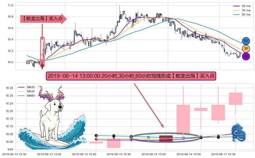 形态多维评估: ⚀ 2019-06-14 13:00:00小时显现 20小时-30小时-60小时均线 【蛟龙出海】买入点 看多信号,后市看涨,买入