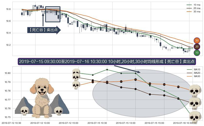 形态多维评估: ⚀ 2019-07-15 10:30:00-小时至2019-07-16 10:30:00-小时显现 10小时-20小时-30小时均线 【死亡谷】卖出点 看空信号,后市看跌,卖出