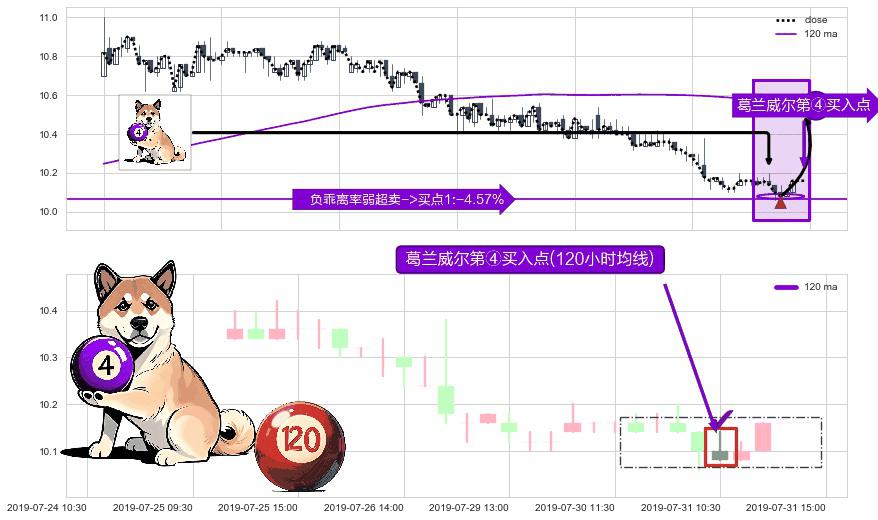 形态多维评估: ⚀ 2019-07-31 10:30:00-小时显现 葛兰威尔均线 120小时均线 第④买入点 下降趋势均值回复的短线反弹信号,后市看涨,买进信号