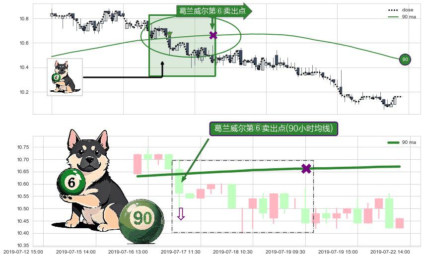 形态多维评估: ⚀ 2019-07-17 09:30:00-小时显现 葛兰威尔均线 90小时均线 第⑥卖出点 走势反转见顶信号,后市看跌,卖出信号