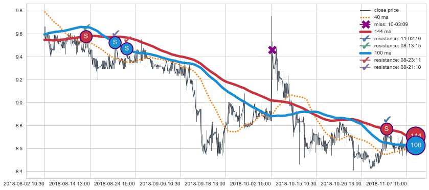 下跌趋势08-02 10:30-11-08 09:30,均线144, 100确认关键阻力4处