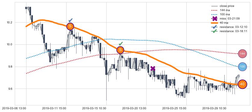 下跌趋势03-06 13:00-04-01 10:30,均线40确认关键阻力2处