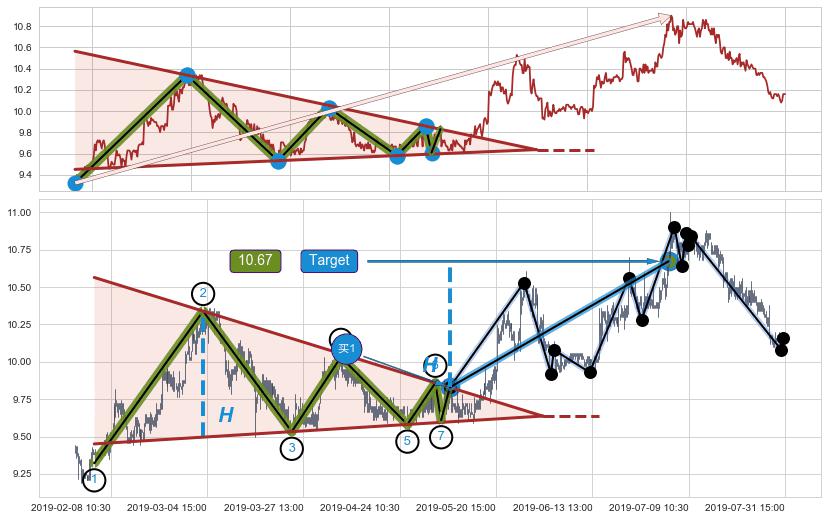 ➢ 最小中继整理涨幅→𝐇: 0.8428 (高点逐步降低斜边第一阻力点②与支撑边垂直距离)