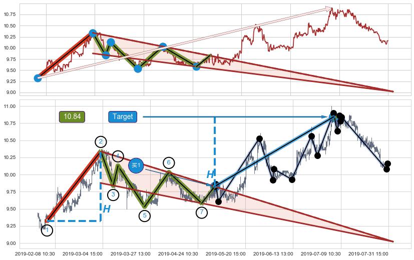 从2019-05-14 15:00至2019-06-21 15:00,共包含163个小时,阶段股价上涨9.72%,阶段股价变动位移路程比: 1 : 6
