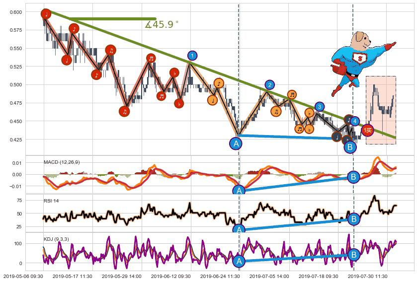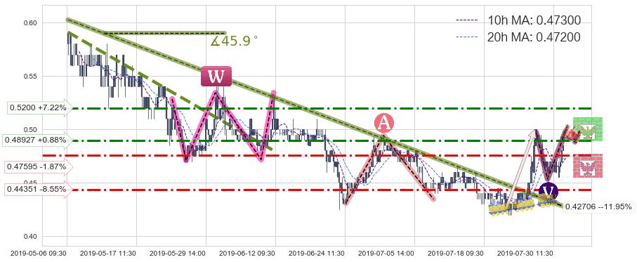 ⚔️ 2019-05-06 10:30-2019-07-26 09:30下跌趋势存在反转上涨[机会],其原下跌趋势的阻力位(0.42706)已被突破[强支撑信号],原下跌趋势角度: 45.9˚
