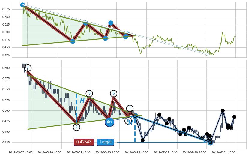 ➢ 最小中继整理跌幅→𝐇: 0.0710000 (低点逐步抬高斜边第一支撑点②与阻力边垂直距离)