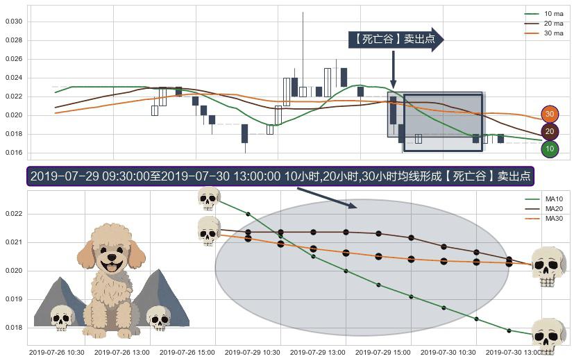 形态多维评估: ⚀ 2019-07-29 10:30:00-小时至2019-07-30 13:00:00-小时显现 10小时-20小时-30小时均线 【死亡谷】卖出点 看空信号,后市看跌,卖出