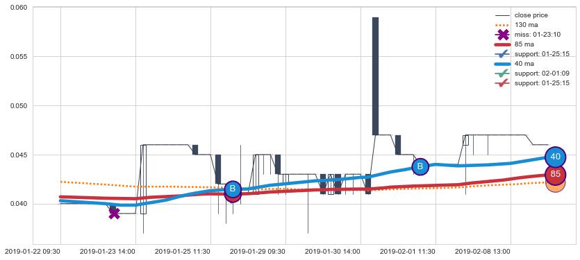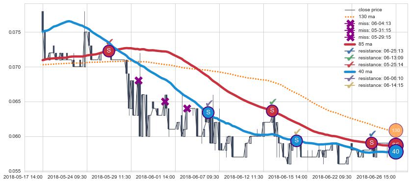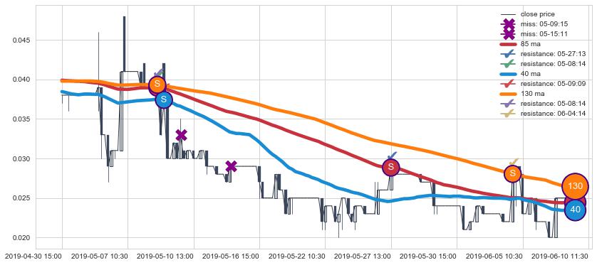 下跌趋势04-30 15:00-06-10 11:30,均线40, 130, 85确认关键阻力4处