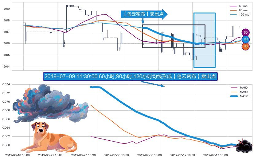 形态多维评估: ⚀ 2019-06-26 14:00:00小时-2019-07-18 15:00:00小时显现 60小时-90小时-120小时均线 【乌云密布】卖出点 看空信号,后市看跌,卖出