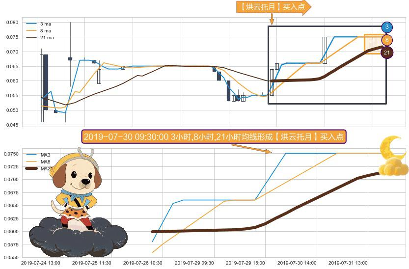 形态多维评估: ⚀ 2019-07-26 09:30:00小时-2019-07-31 15:00:00小时显现 3小时-8小时-21小时均线 【烘云托月】买入点 看多信号,后市看涨,买入