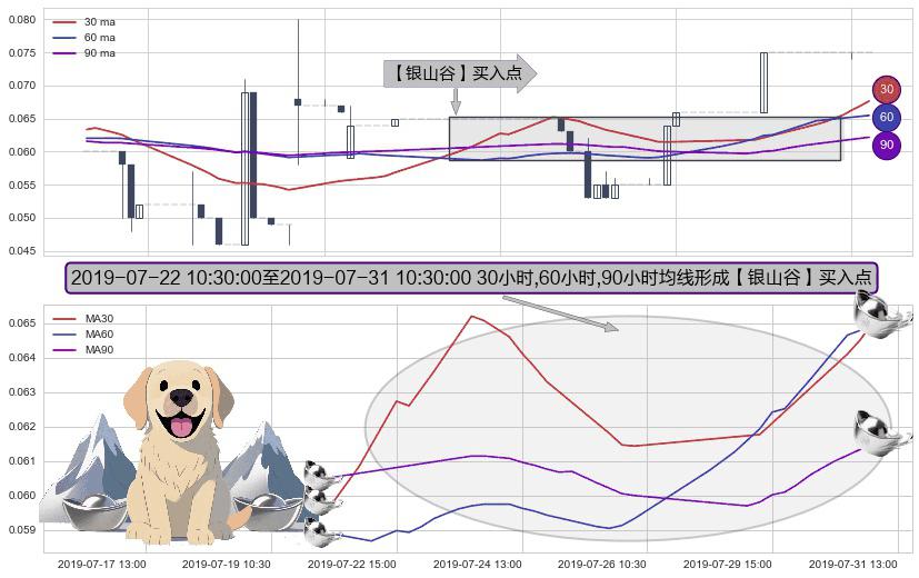 形态多维评估: ⚀ 2019-07-22 11:30:00-小时至2019-07-31 10:30:00-小时显现 30小时-60小时-90小时均线 【银山谷】买入点 看多信号,后市看涨,买入