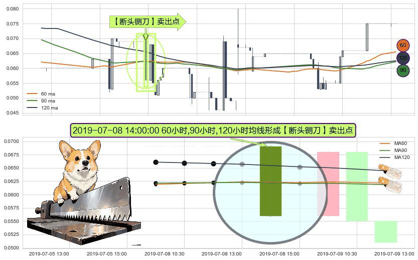 形态多维评估: ⚀ 2019-07-08 14:00:00小时显现 60小时-90小时-120小时均线 【断头铡刀】卖出点 看空信号,后市看跌,卖出