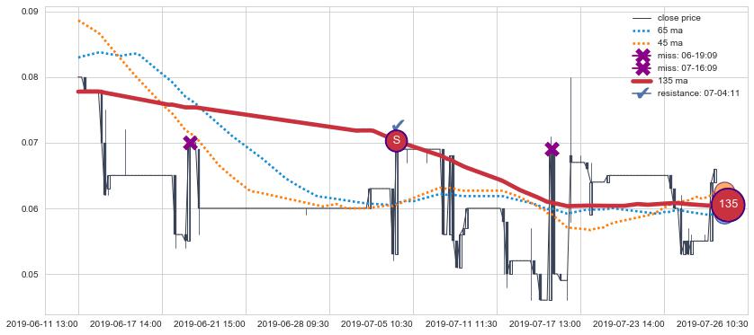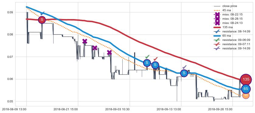 下跌趋势08-09 13:00-09-28 11:30,均线65, 135确认关键阻力4处