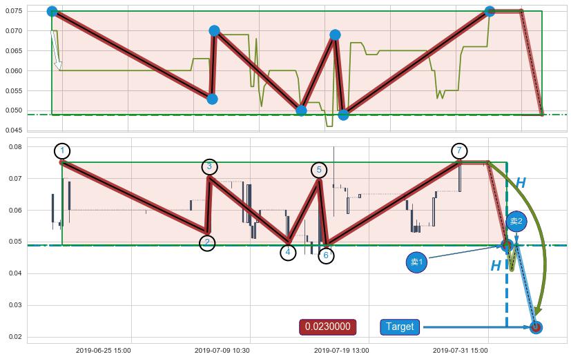 ➣ 【阻力】连续作用在→【③⑤⑦】形成上阻力震荡平行线