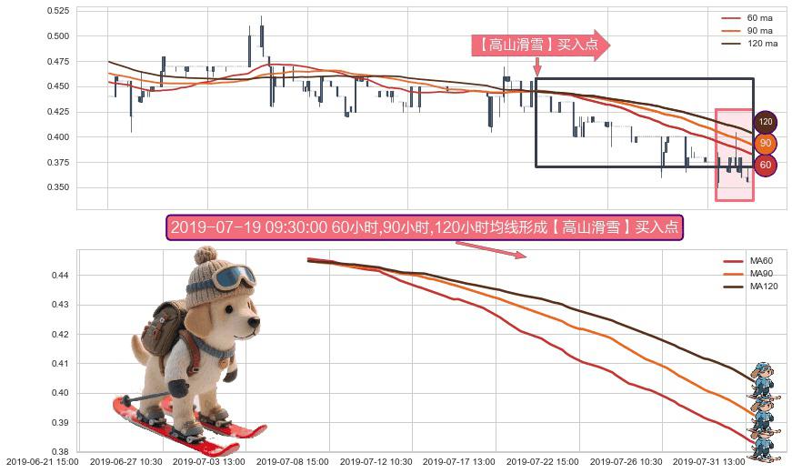 形态多维评估: ⚀ 2019-07-08 09:30:00小时-2019-07-31 15:00:00小时显现 60小时-90小时-120小时均线 【高山滑雪】买入点 看多信号,后市看涨,买入