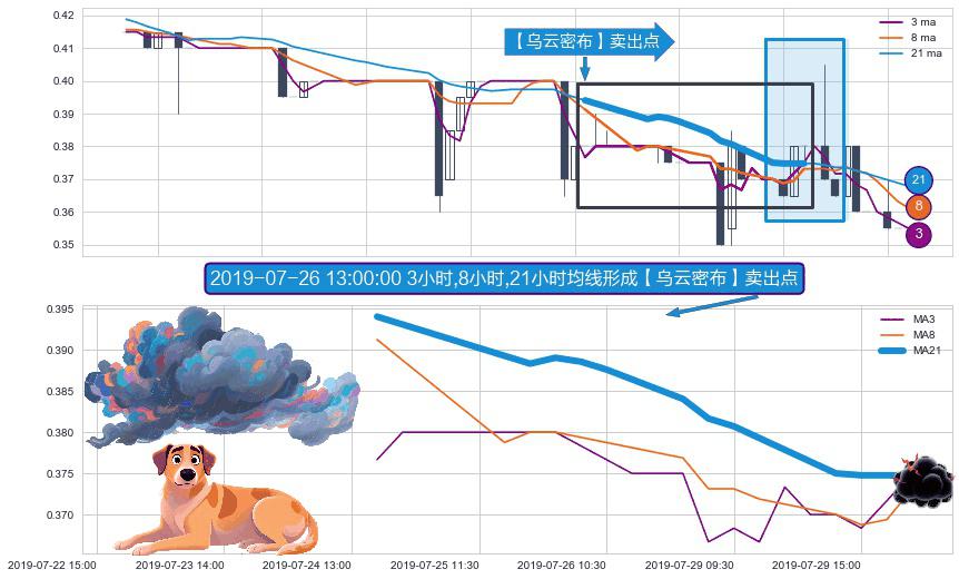 形态多维评估: ⚀ 2019-07-24 14:00:00小时-2019-07-30 10:30:00小时显现 3小时-8小时-21小时均线 【乌云密布】卖出点 看空信号,后市看跌,卖出