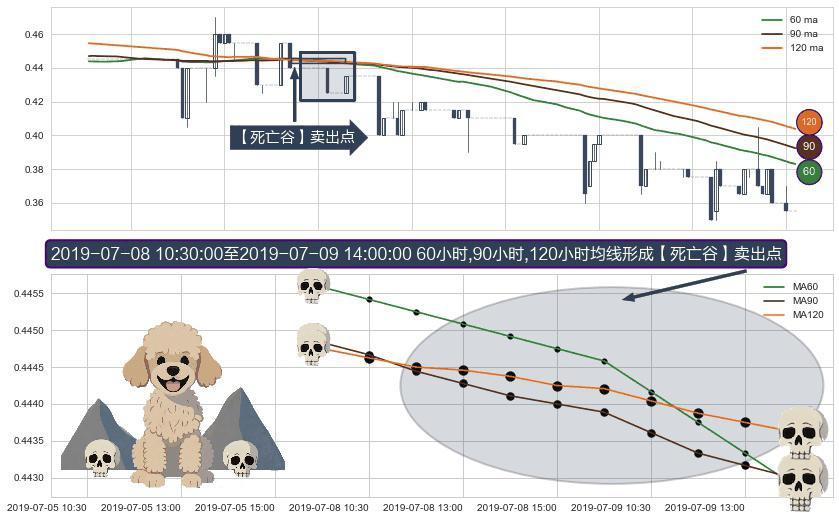 形态多维评估: ⚀ 2019-07-08 11:30:00-小时至2019-07-09 14:00:00-小时显现 60小时-90小时-120小时均线 【死亡谷】卖出点 看空信号,后市看跌,卖出