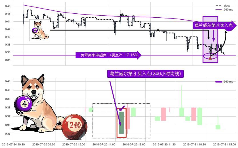 形态多维评估: ⚀ 2019-07-26 15:00:00-小时显现 葛兰威尔均线 240小时均线 第④买入点 下降趋势均值回复的短线反弹信号,后市看涨,买进信号