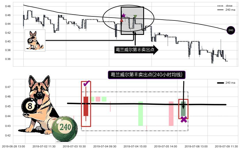 形态多维评估: ⚀ 2019-07-05 15:00:00-小时显现 葛兰威尔均线 240小时均线 第⑧卖出点 下降趋势的中继信号,后市看跌,卖出信号