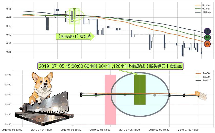 形态多维评估: ⚀ 2019-07-05 15:00:00小时显现 60小时-90小时-120小时均线 【断头铡刀】卖出点 看空信号,后市看跌,卖出