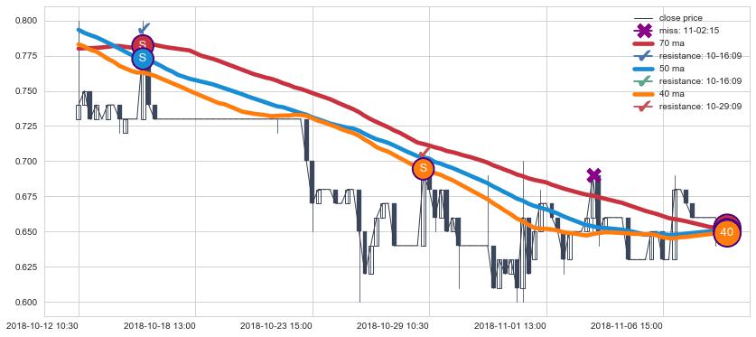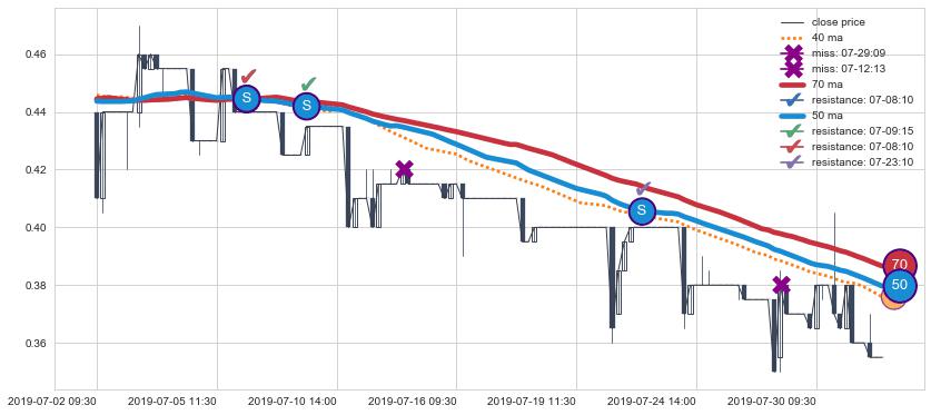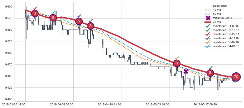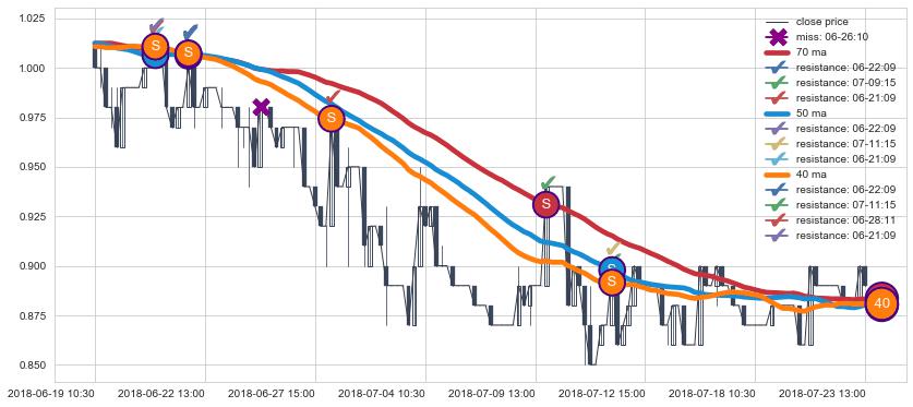下跌趋势06-19 10:30-07-23 13:00,均线40, 50, 70确认关键阻力5处