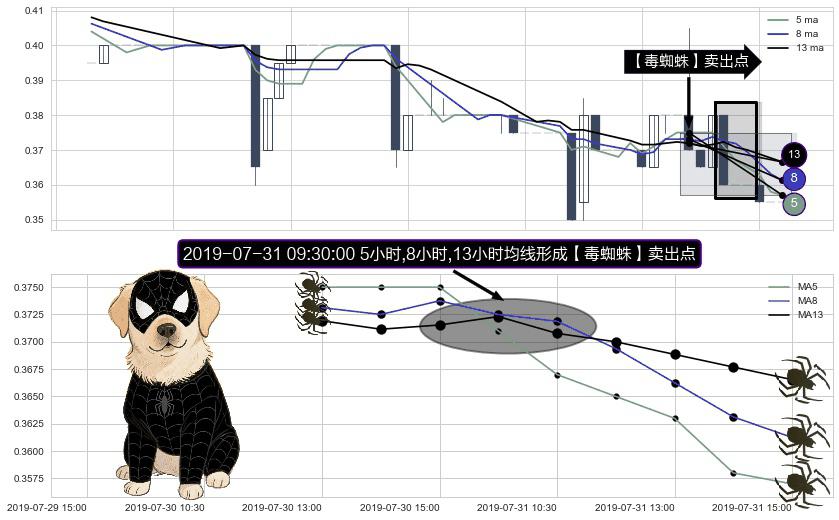 形态多维评估: ⚀ 2019-07-31 09:30:00小时显现 5小时-8小时-13小时均线 【毒蜘蛛】卖出点 看空信号,后市看跌,卖出