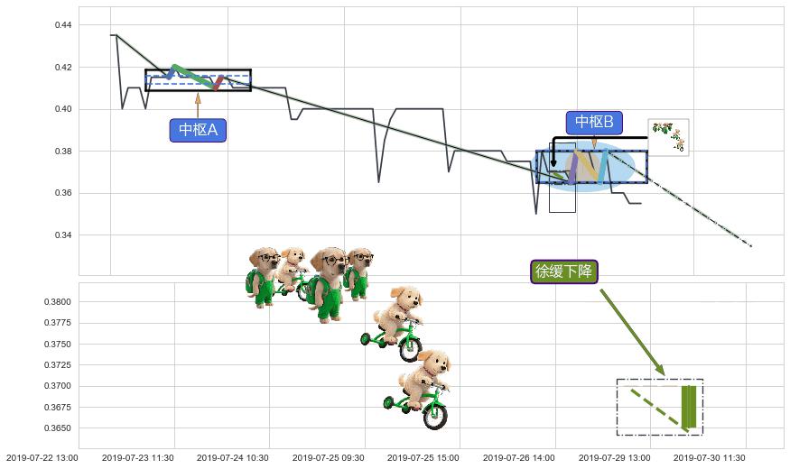➢ 【中枢B】:07-29:15-07-30:15,中枢由4笔构成,共7交易小时, ZG=0.38000, ZD=0.36500