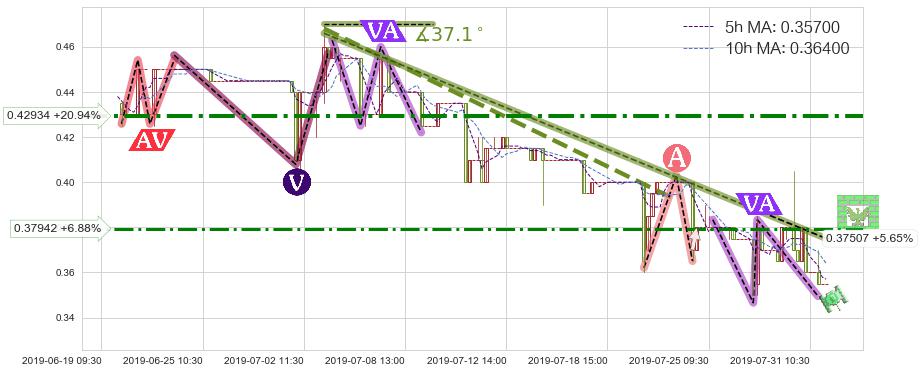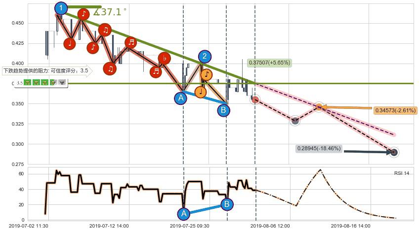 ➣ 预测:2019-08-09 13:00,【试探阻力】稳定目前下跌趋势的前提下,预测价格:0.34573
