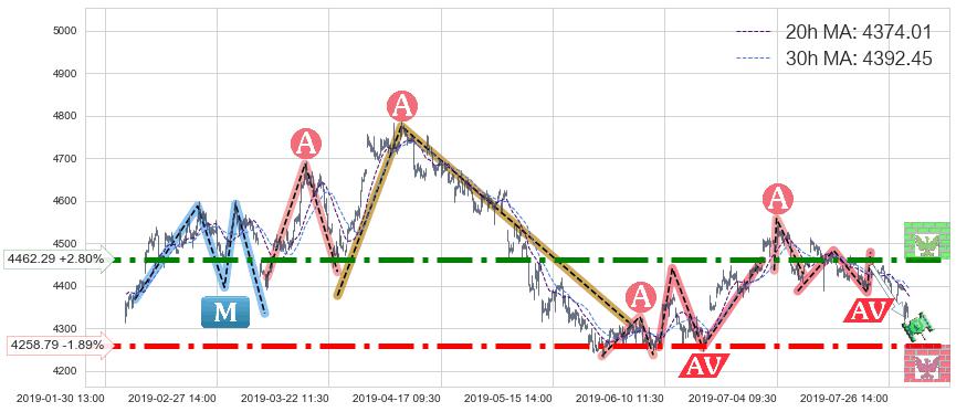 ♘ 阻力价格位4462.29,可信任强度97.23%,距离最后交易2019-07-31 15:00形成的收盘价格4340.77相差 +2.80%