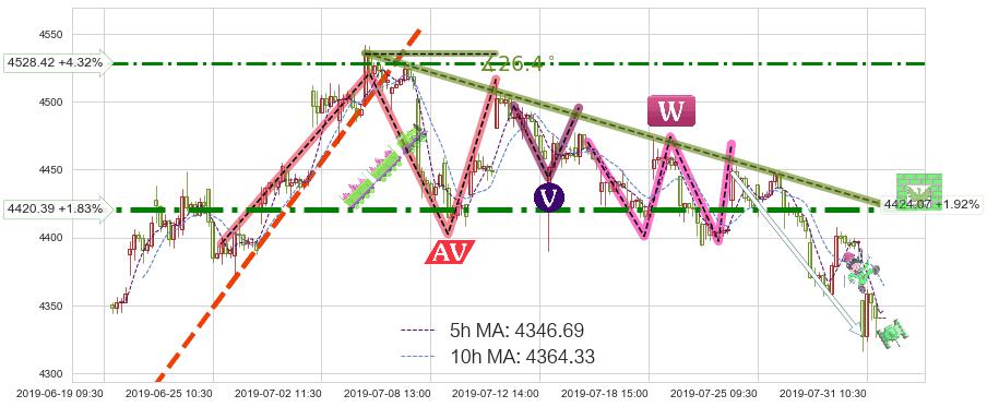 ♘ 在最后的下跌阶段2019-07-04 09:30至2019-07-31 14:00,存在 持续未破位的阻力位 ,阻力价格4424.07,可信任强度80.55%,其距离最后价格4340.77相差 +1.92%