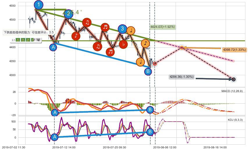 ➢ 预测:2019-08-07 12:00,【小幅反弹】稳定目前下跌趋势的前提下,预测价格:4398.72